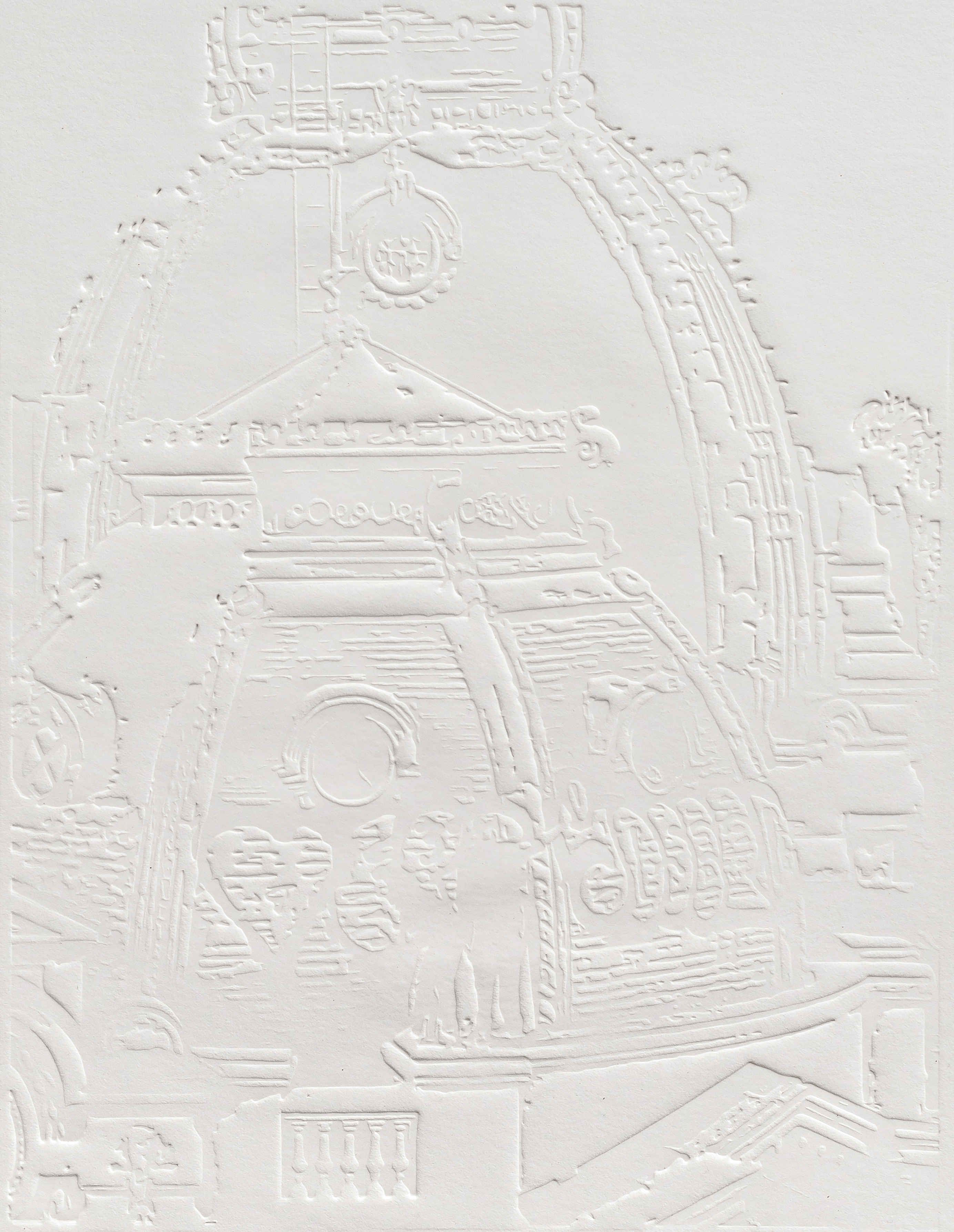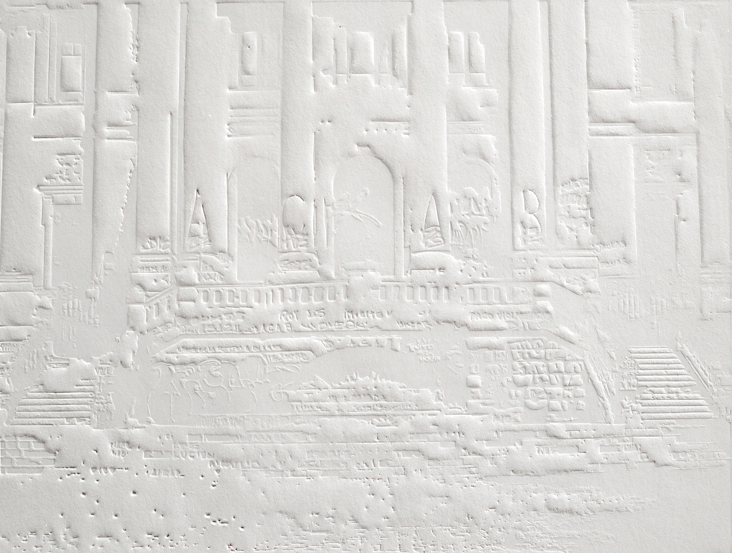 A través del proceso del gofrado, técnica de grabado donde se altera la superficie del papel creando relieves que hacen aparecer la imagen, se busca traer a la vista desde la aparente invisibilidad de la hoja en blanco, distintos edificios e hitos arquitectónicos de carácter histórico de Santiago, con el objetivo de reflexionar sobre aquellos espacios que a pesar de formar parte de nuestra memoria colectiva, han sido víctimas del abandono, violencia o falta valoración.