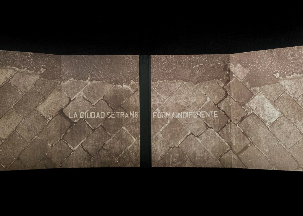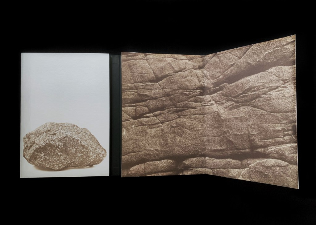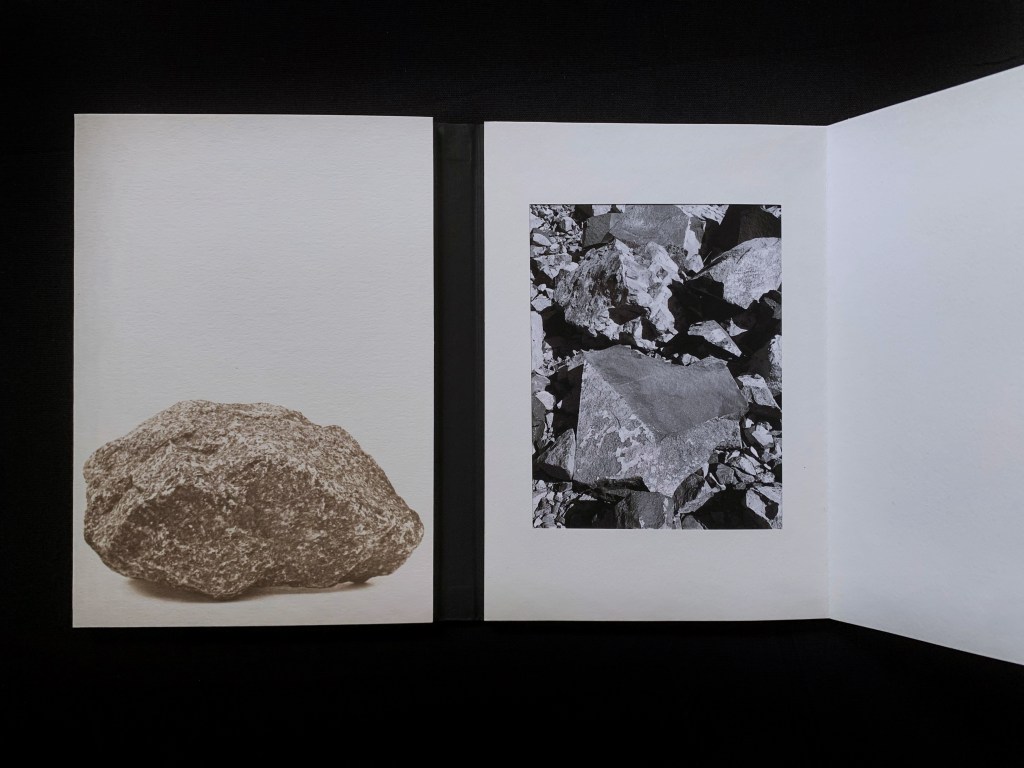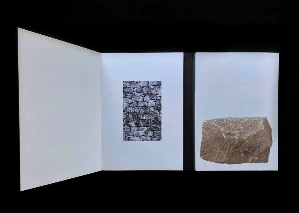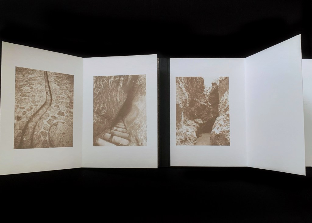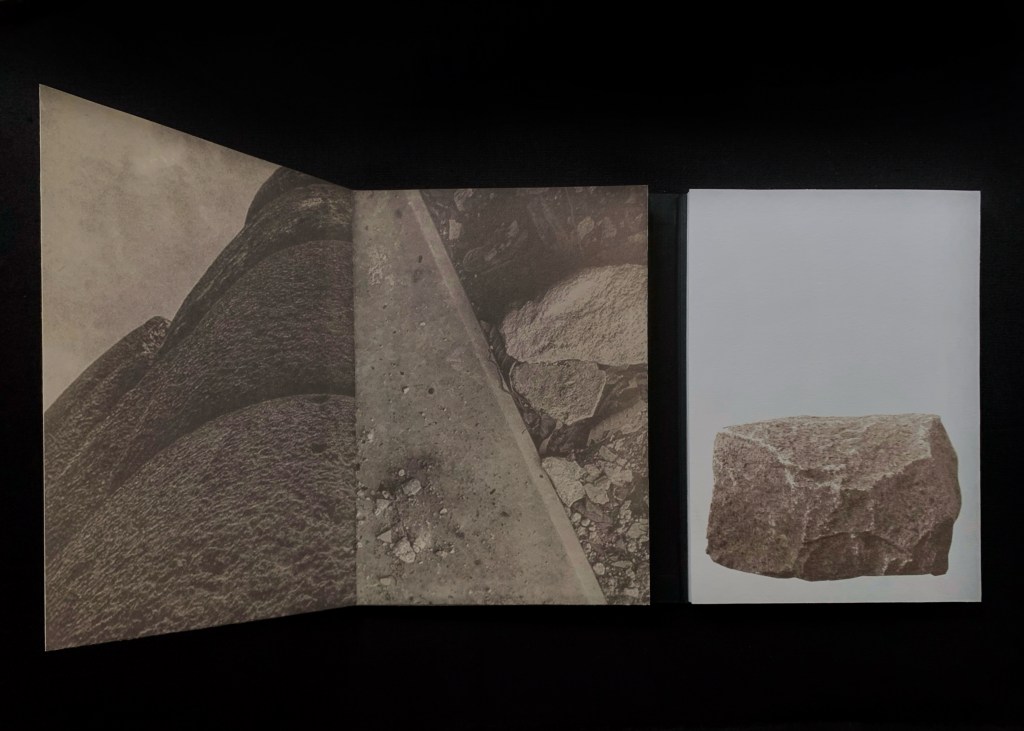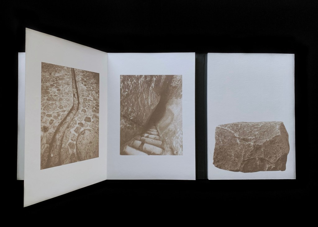 El libro se instala como un objeto artístico único, el cual despliega un diálogo entre lo natural y lo construido: fragmentos pétreos, roca bruta, grieta, adoquín emergente, imágenes que se convierten en el testimonio de un progreso y un desgaste; texturas que oscilan entre la áspera geología original y la intervención humana. No se trata de una confrontación, sino de una fusión, un territorio híbrido donde la grieta se convierte en ruta, la fisura en señal y la superficie erosionada en testigo de nuestra huella colectiva.